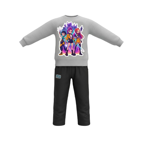 Conjunto con pantalón negro y buzo en 3 colores disponibles (lila, palo de rosa y gris). estampados en la parte delantera.
